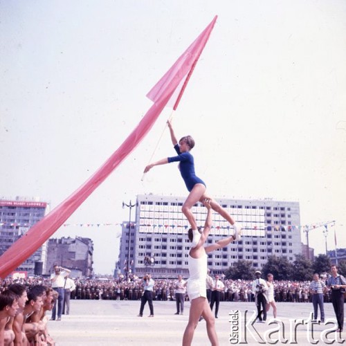 Plac Defilad, uroczyste obchody dwudziestolecia PRL - grupa dziewcząt z piłkami.