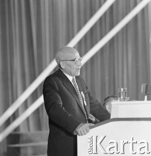 Uroczyste obchody piętnastolecia PRL, przegląd wojsk, przy mikrofonie minister obrony narodowej gen. Marian Spychalski, na lewo od niego kolejno: I sekretarz KC PZPR Władysław Gomułka, I sekretarz KC KPZR Nikita Chruszczow, premier Józef Cyrankiewicz, na prawo od Spychalskiego stoi przewodniczący Rady Państwa Aleksander Zawadzki.