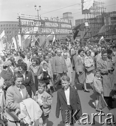 Obchody święta 1 Maja, pochód idzie ulicą Marszałkowską, na pierwszym planie samochód marki FSO Warszawa wiezie karykaturę satyryczno-propagandową przedstawiającą Adolfa Hitlera jako anioła. Za samochodem idą pracownicy Instytutu Badań Jądrowych, w tle po lewej trybuna honorowa.