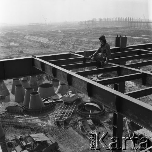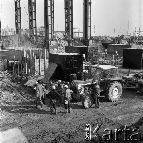Budowa Huty Katowice, grupa robotników na placu budowy obok traktora.