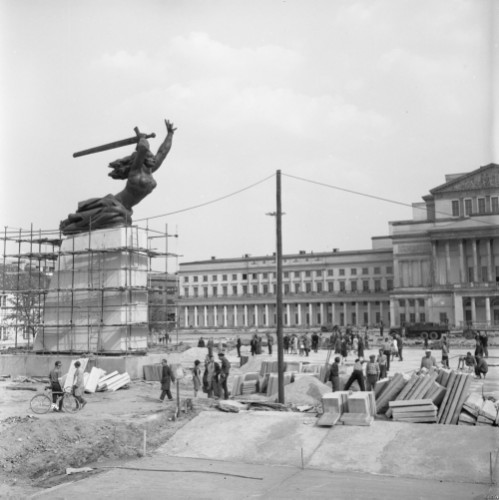 Przystanek autobusowy przy Rondzie Warszyngtona, z lewej Pomnik Żołnierzy Radzieckich przed wejściem do Parku Skaryszewskiego, z prawej wieżowiec zaprojektowany przez Marka Leykama.