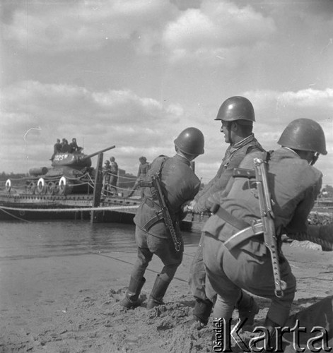 Wojska saperskie ćwiczą przeprawę przez Wisłę - czołg na promie.