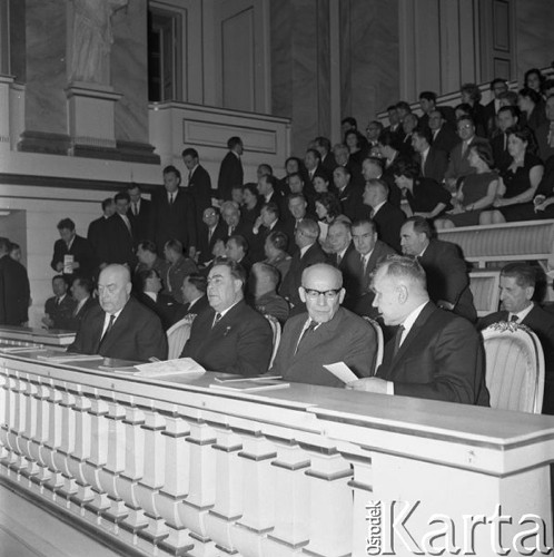Wizyta radzieckich władz państwowych w 20. rocznicę zawarcia układu o przyjaźni między Polską a ZSRR - stoją od lewej: Aleksiej Kosygin, Andriej Gromyko (z tyłu), Leonid Breżniew, Władysław Gomułka, Józef Cyrankiewicz i Zenon Kliszko.