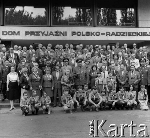 VI Krajowy Zjazd TPPR, członkowie radzieckiej delegacji na krakowskim Rynku wśród gołębi, na pierwszym planie karmniki dla ptaków leżące na sankach. W tle fragment Sukiennic.