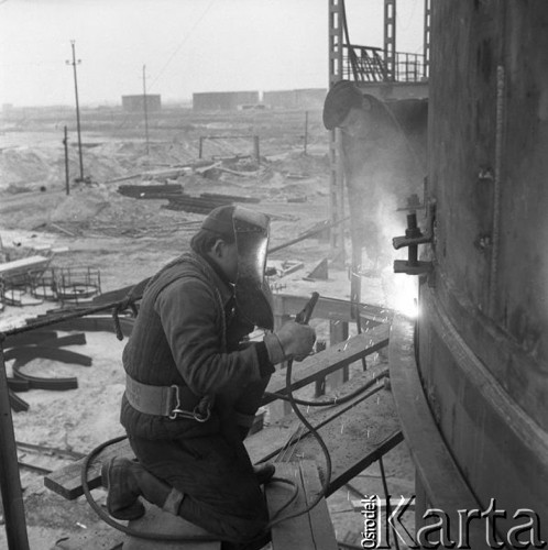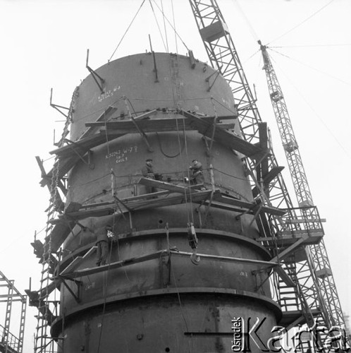 Budowa Mazowieckich Zakładów Rafineryjnych i Petrochemicznych, robotnicy na rusztowaniu.
