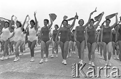 Obchody piętnastolecia PRL, defilada wojskowo-sportowa, idą dziewczęta w białych i czerwonych strojach.