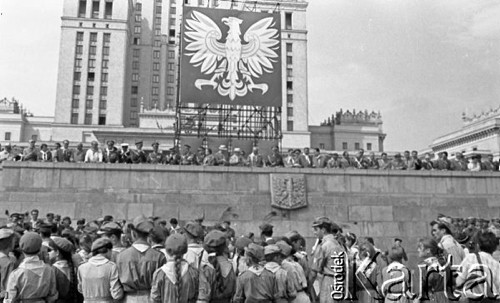 Uroczyste obchody piętnastolecia PRL z udziałem Nikity Chruszczowa, I sekretarza KC KPZR. Oddziały Ludowego Wojska Polskiego przechodzą ze sztandarami przed trybuną honorową.
