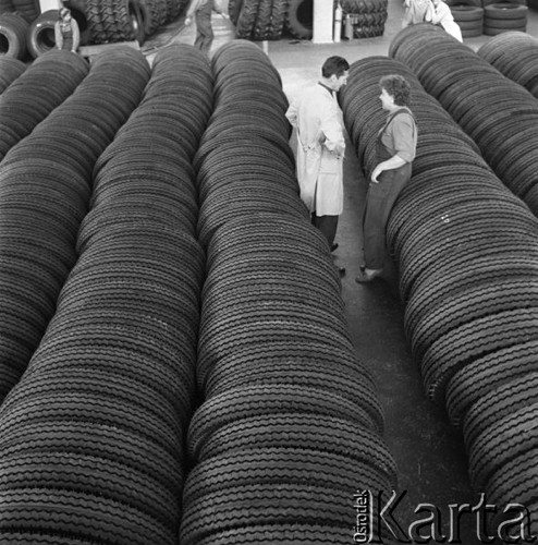Pracownicy Olsztyńskich Zakładów Opon Samochodowych "Stomil-Olsztyn" w magazynie.