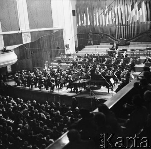 VI Międzynarodowy Konkurs Pianistyczny im. Fryderyka Chopina. Koncert inauguracyjny w Filharmonii Narodowej - Artur Rubinstein z Orkiestrą Symfoniczną Filharmonii pod dyrekcją Witolda Rowickiego.