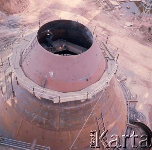 Budowa Huty Katowice, spawacz pracujący we wnętrzu stalowego silosa.