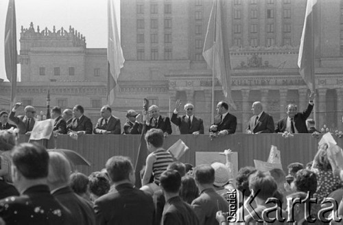 Obchody święta 1 Maja, na trybunie stoją od prawej: NN, Józef Cyrankiewicz, Józef Kępa, Władysław Gomułka i Marian Spychalski.