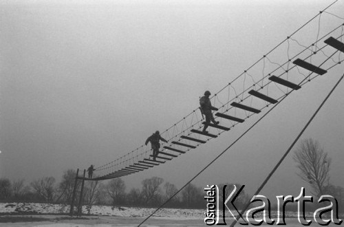 Słuchacze Wyższej Oficerskiej Szkoły Wojsk Zmechanizowanych we Wrocławiu podczas ćwiczeń na poligonie. Żołnierze przechodzą przez most wiszący.