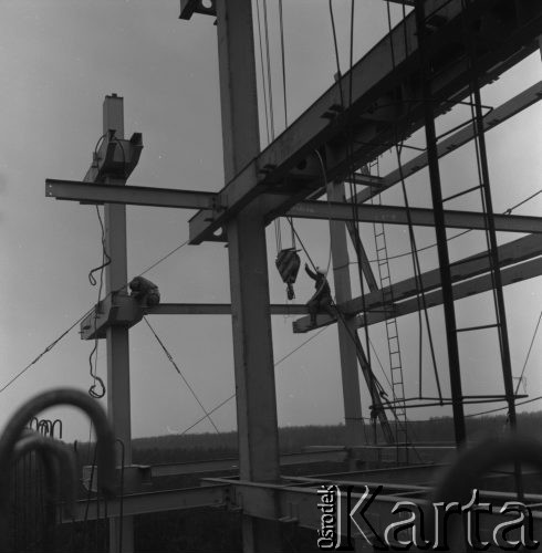 Budowa Centrum Zdrowia Dziecka, prace wysokościowe, robotnicy w kaskach i odzieży ochronnej.