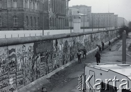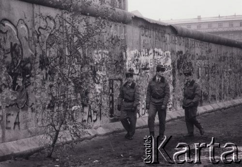 Upadek Muru Berlińskiego, trzej niemieccy żołnierze idący wzdłuż muru.