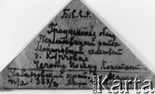 List złożony w trójkąt. Część adresowa, napis po rosyjsku: BSSR, Grodnienskaja obłast', Bieriestowskij rajon, Makarowskij Sielsowiet, d. Kurczewce, Czeczotu Josifu Konstantinowiczu, Chabarowskij Kraj, g. Magadan, p/ja 383/2, Janusz Czeczot.