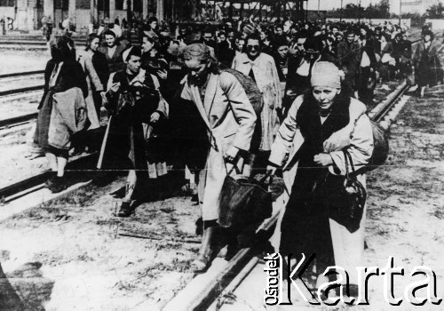 Grupa kobiet w obozie Dulag 121 przed halą nr 5 po opuszczeniu Warszawy podczas powstania warszawskiego. N/z Joanna Radke (2L, z torbą na piersiach).