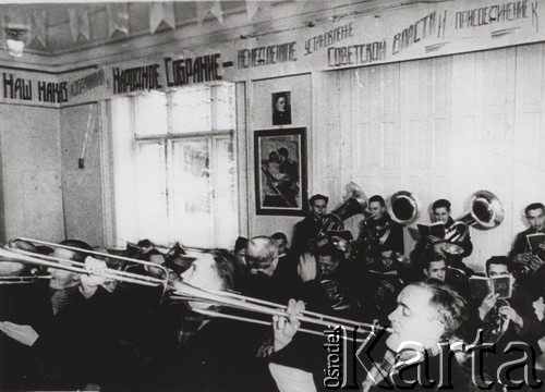 Uczestnicy wiecu z plakatami propagandowymi, na jednym widnieje Józef Stalin, drugi to plakat W. Korieckiego przedstawiający "wyzwolonego" chłopa całującego się z żołnierzem Armii Czerwonej.