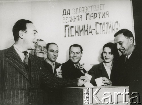 Wyborcy przy urnie, na ścianie wisi hasło: "Witamy wielką partię Lenina-Stalina".