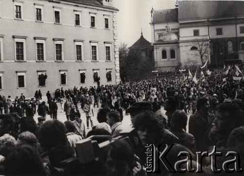 Stan wojenny - niezależna manifestacja zorganizowana przez podziemne struktury "Solidarności" w dniu Święta Pracy na Starym Mieście; na zdjęciu ulica Miodowa, obok Pałac Arcybiskupów Warszawskich.