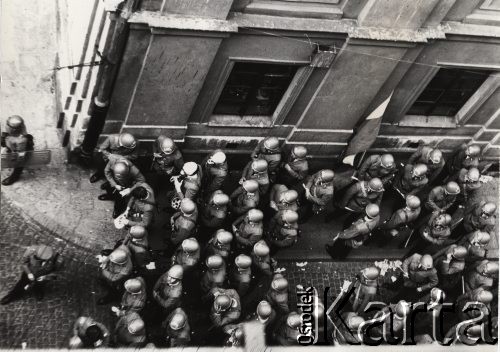 Stan wojenny - niezależna manifestacja zorganizowana przez podziemne struktury "Solidarności" w dniu Święta Pracy na Starym Mieście; na zdjęciu manifestacja na placu Krasińskich.