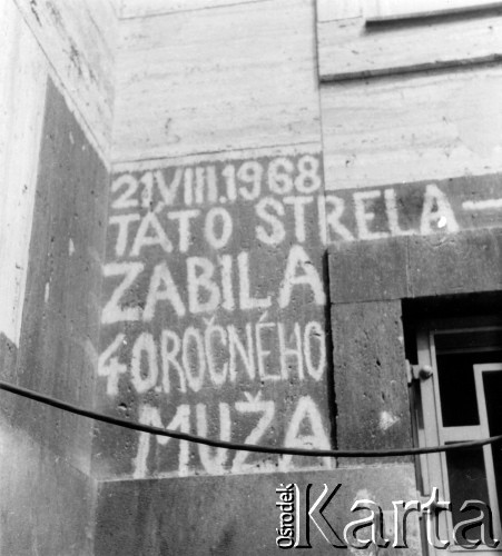 Interwencja wojsk Układu Warszawskiego, napis na ścianie domu: "21 VIII 1968 ta kula zabiła czterdziestoletniego mężczyznę".