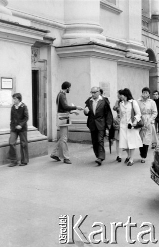 Akcja Komitetu Obrony Robotników w obronie Błażeja Wyszkowskiego, Antoni Macierewicz rozdaje ulotki przed kościołem św. Anny.