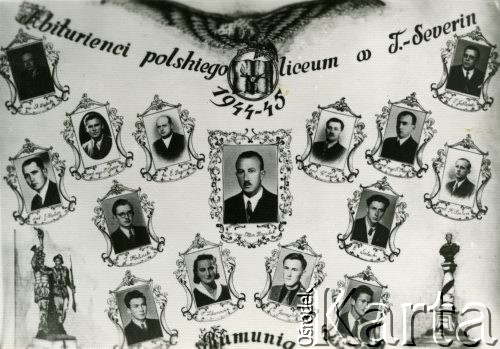 Abiturienci polskiego liceum w Turnu Severin 1944-45; na zdjęciu: inż. St. Dębicki, J. Jabłoński, W. Zych, F. Kaute, K. Batosz, M. Jarosz, ks. E.Degórski, J. Pastwa, w środku Otton Hryculak (największa fotografia); maturzyści: Jerzy Kaliński, Teresa Zdanowicz, Mieczysław Jaryczyński, Edward Solecki.