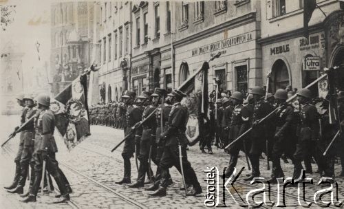 Pogrzeb Marszałka Józefa Piłsudskiego - poczty z chorągwiami wojskowymi w kondukcie pogrzebowym. W tle widoczna jest zabudowa krakowskiej ulicy.