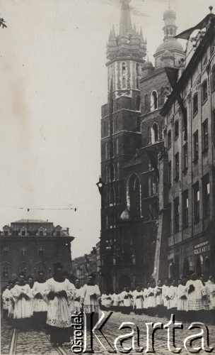 Pogrzeb Marszałka Józefa Piłsudskiego - poczty z chorągwiami wojskowymi w kondukcie pogrzebowym. W tle widoczna jest zabudowa krakowskiej ulicy.