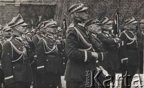 Pogrzeb Marszałka Józefa Piłsudskiego - kondukt pogrzebowy. Na pierwszym planie widoczna jest ustawiona na lawecie trumna nakryta chorągwią w barwach narodowych, na której znajduje się buława marszałkowska i maciejówka. W tle - ludność cywilna obserwująca uroczystość.