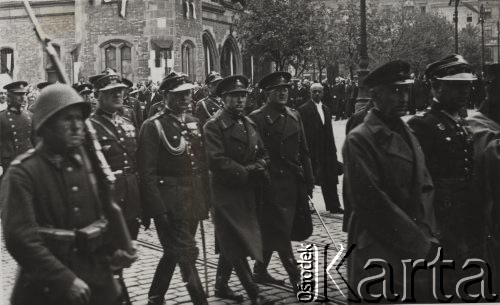 Pogrzeb Marszałka Józefa Piłsudskiego - delegacja rumuńska maszeruje w kondukcie pogrzebowym. W tle - ludność cywilna obserwująca uroczystość.