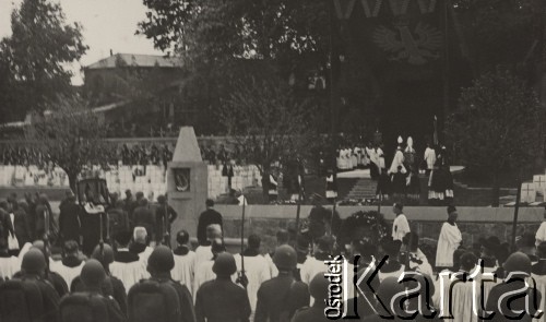 Uroczystość złożenia serca Marszałka Józefa Piłsudskiego oraz Marii Piłsudskiej z Billewiczów we wspólnym grobie na cmentarzu na Rossie. Na pierwszym planie żołnierze biorący udział w wydarzeniu, w tle widoczny jest Cmentarz Wojskowy.