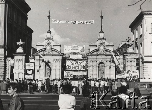 Strajk okupacyjny w sprawie legalizacji Niezależnego Zrzeszenia Studentów - manifestanci zgromadzeni przed Bramą Główną Uniwersytetu Warszawskiego. Na bramie zawieszone zostały transparenty: "Zarejestrować NSZ Solidarność", "Jednodniowy strajk okupacyjny", "Studenci SGGW z Wami". Po prawej stronie zostały wywieszone postulaty studentów.