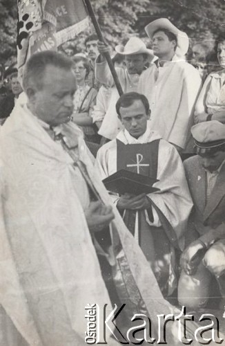 Ksiądz Jerzy Popiełuszko, ksiądz Czesław Banaszkiewicz (po lewej stronie) oraz poczet sztandarowy Huty Warszawa.