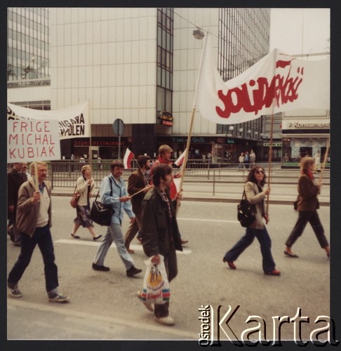 Pochód 1-majowy. Transparent "Solidarność" niesie Halina Goldfarb ze sztokholmskiego biura "S". Na tablicy napis: "Frige Michal Kubiak" - Uwolnić Michała Kubiaka. W jasnym swetrze Katarzyna Sławska.