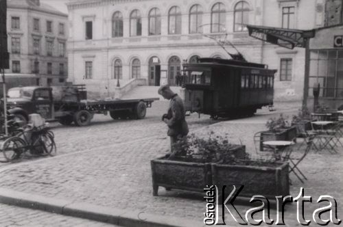Kapral Wehrmachtu robiący zdjęcia na ulicy, za nim tramwaj.