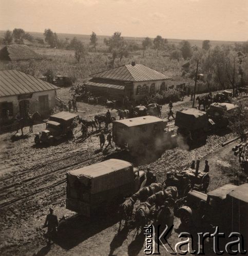 Przeprawa wojsk niemieckich przez Dniepr po moście pontonowym, z prawej most z wysadzonym przęsłem.