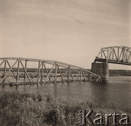 Przeprawa wojsk niemieckich przez Dniepr po moście pontonowym, na pierwszym planie most z wysadzonym przęsłem.