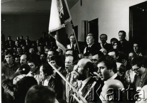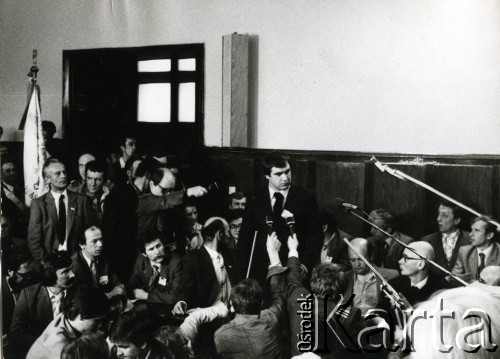 Rejestracja NSZZ "Solidarności" Rolników Indywidualnych. W budynku Sądu Wojewódzkiego. Jan Kułaj, przewodniczący "Solidarności" RI wśród dziennikarzy i działaczy związku.