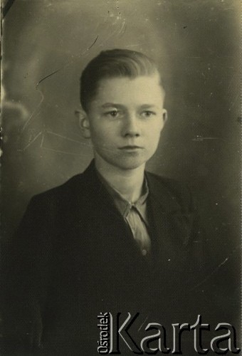 Portret chłopca w marynarce, jasnej koszuli i krawacie.