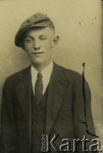 Portret młodego mężczyzny w kaszkiecie, marynarce, jasnej koszuli i krawacie.