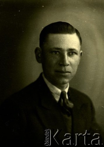 Portret mężczyzny w marynarce, ciemnej koszuli i krawacie.