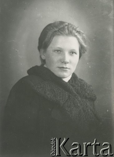 Portret młodej kobiety w palcie z barankowym kołnierzem.