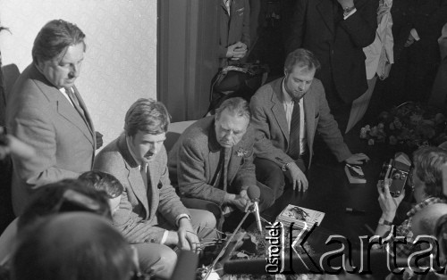 Wizyta Czesława Miłosza w Polsce po otrzymaniu Literackiej Nagrody Nobla - konferencja prasowa z udziałem noblisty. Po prawej stronie pisarza siedzi jego syn, Antoni Miłosz, po lewej - drugi syn, Piotr Miłosz.