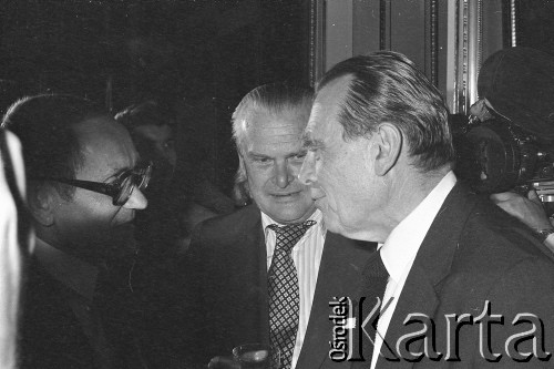 Wizyta Czesława Miłosza w Polsce po otrzymaniu Literackiej Nagrody Nobla - spotkanie z poetą w Pałacu na Wodzie w Łazienkach Królewskich. Od lewej stoją: pisarz Tadeusz Konwicki, dziennikarz i publicysta Karol Małcużyński oraz Czesław Miłosz.