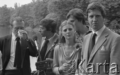 Wizyta Czesława Miłosza w Polsce po otrzymaniu Literackiej Nagrody Nobla - poeta z synami Antonim (na lewo) i Piotrem przed Pałacem na Wodzie w Łazienkach Królewskich.