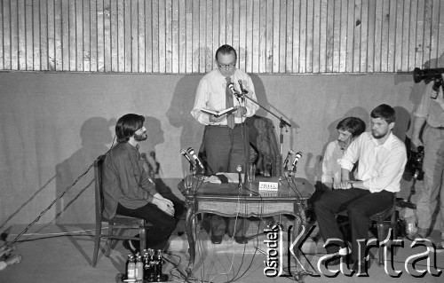 Wizyta Czesława Miłosza w Polsce po otrzymaniu Literackiej Nagrody Nobla - spotkanie z czytelnikami w Centralnym Klubie Studentów Politechniki Warszawskiej "Stodoła". Przy stoliku, od prawej strony: Krzysztof Kopczyński, przewodniczący Koła Młodych Polonistów przy Uniwersytecie Warszawskim, Czesław Miłosz i Piotr Bratkowski, przewodniczący Warszawskiego Koła Młodych przy Oddziale Warszawskim Związku Literatów Polskich.