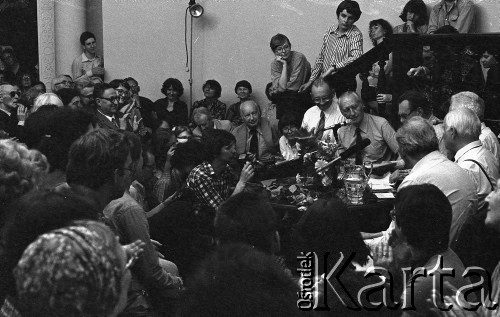 Wizyta Czesława Miłosza w Polsce po otrzymaniu Literackiej Nagrody Nobla - spotkanie z pisarzem w PEN Clubie w Pałacu Kultury i Nauki. Przy stoliku siedzą, od lewej strony - Władysław Bartoszewski, NN, Czesław Miłosz.