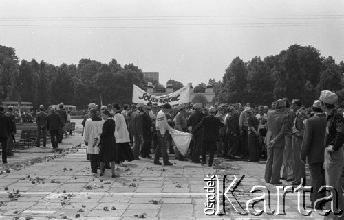 Pogrzeb Kardynała Stefana Wyszyńskiego - delegacja Solidarności z transparentem. W tle - Grób Nieznanego Żołnierza oraz Ogród Saski. Na placu rozrzucone zostały kwiaty.