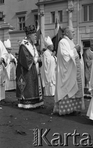 Pogrzeb Kardynała Stefana Wyszyńskiego - rozrzucone na placu kwiaty, po bokach stoją delegacje górników oraz księża. W tle widoczny jest ołtarz z krzyżem.